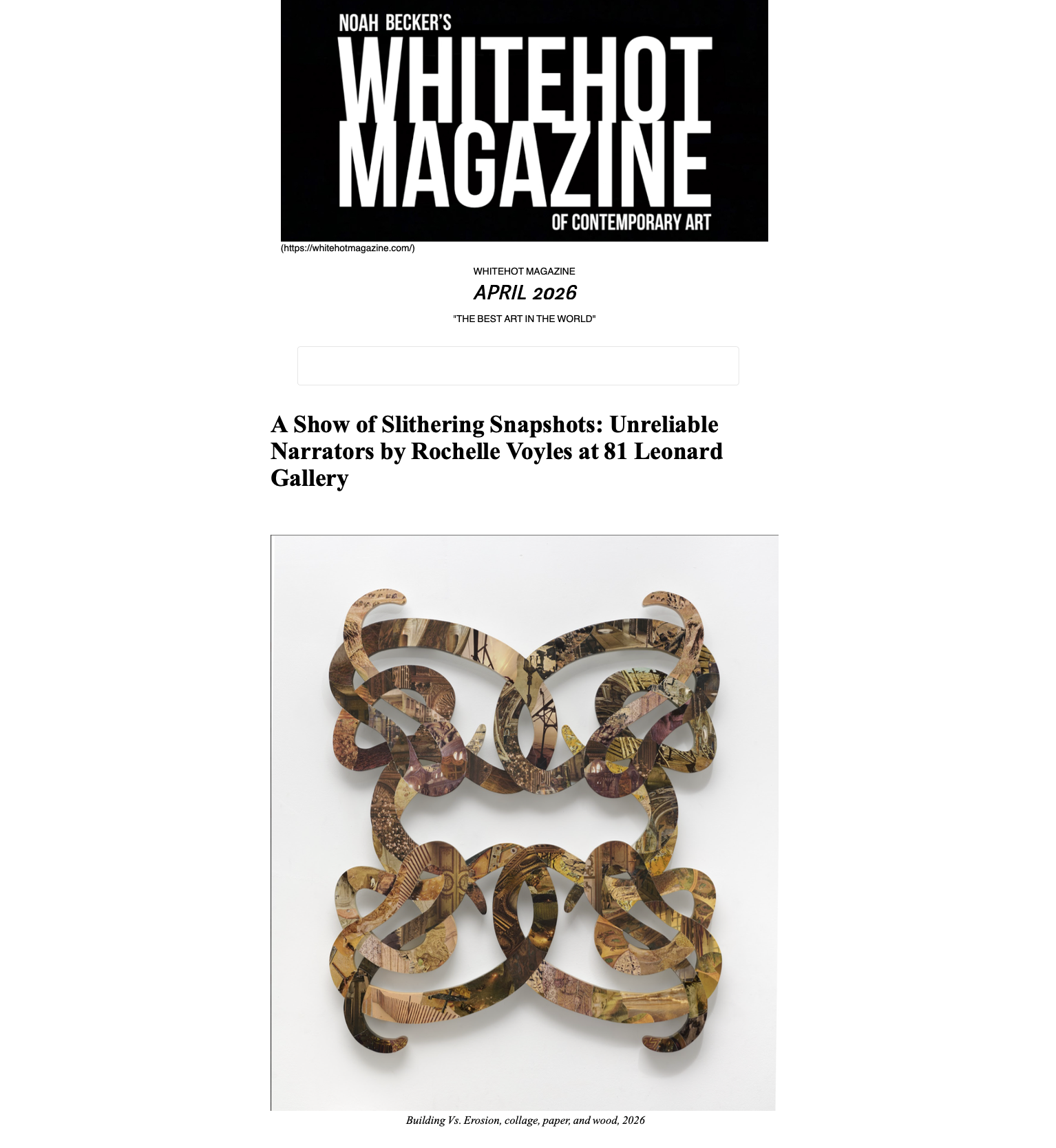 Sherman, Kate, “A Show of Slithering Snapshots: Unreliable Narrators by Rochelle Voyles”, WhiteHot Magazine, March 31, 2026